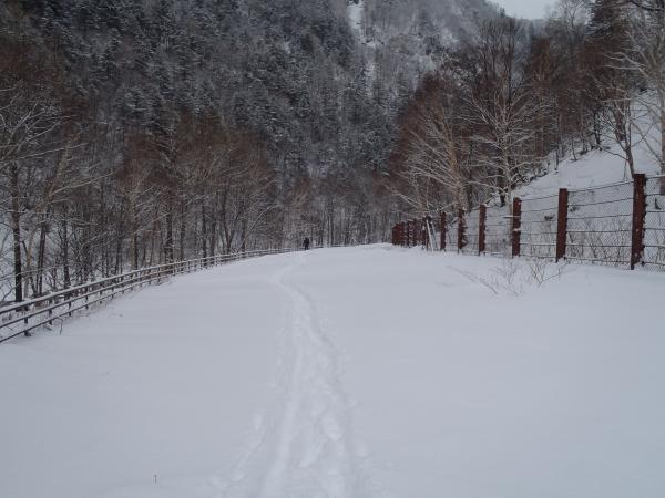 スキーがあると気持ち早い。渡渉の部分が一部薄い箇所もあったので
