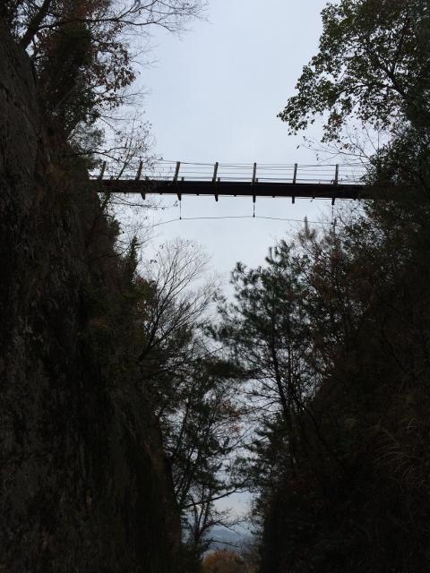 登山口から入り登りきりで笠松山・善坊山の分岐があり吊り橋が出てきます。