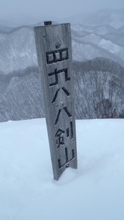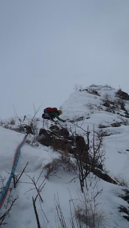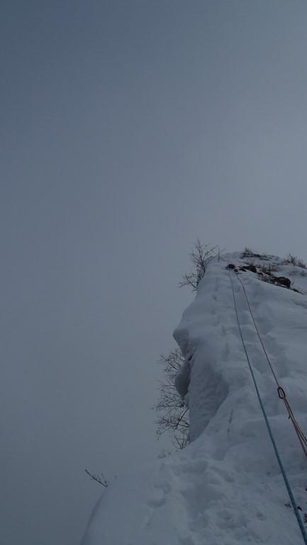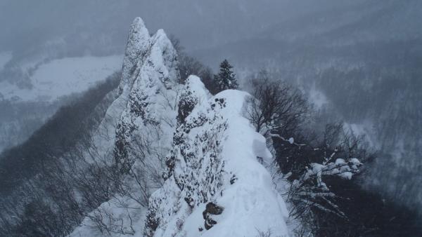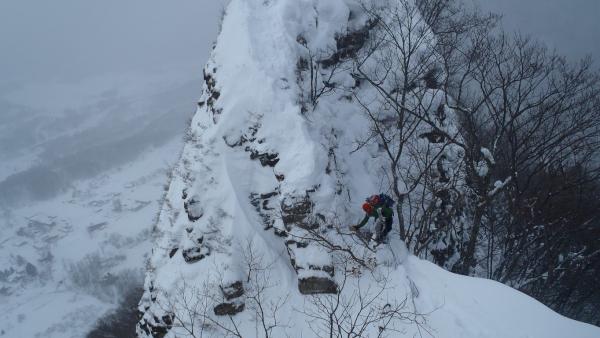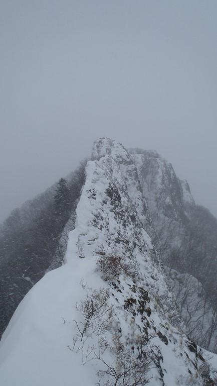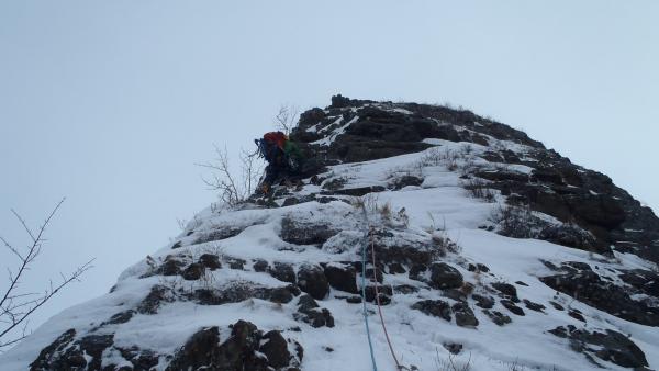 ラッセルに苦しみながら基部に着くと、かなり黒々した感じ。1ピッチ目以降は緊張感あるナイフリッジをひたすら辿りました。結局2時間ほどで頂上。500mにも満たないわずか498mの山ですが、登りごたえのあるミックスクライミングを楽しめました。