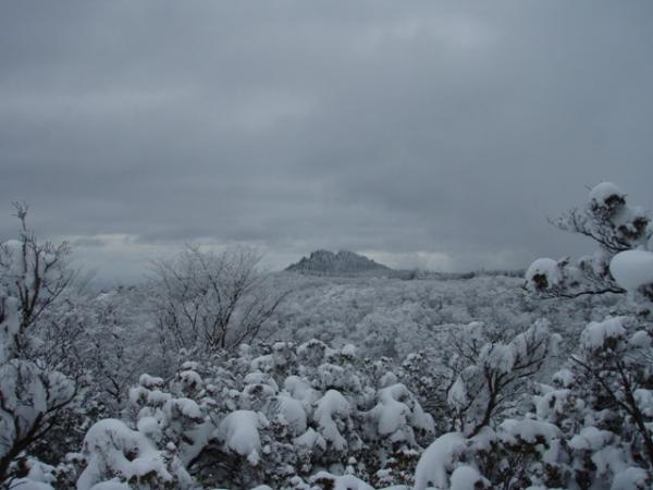 凍った階段を慎重に降り、神社とは別の所にある愛宕山の三角点へ。近道を使って距離を短縮したものの、カチカチに凍った階段が現れたので6本爪アイゼンを装着。首無地蔵への分岐を過ぎ、標識のない次の分岐を右折し、右手の小高い丘に直登。鉄塔のすぐ後ろにある高台に雪に埋もれた三角点がありました。ここからは京都市内が一望できます。気温0度。積雪20cmぐらい。