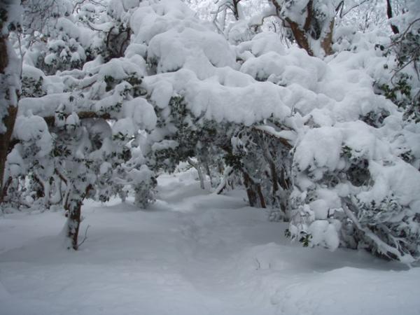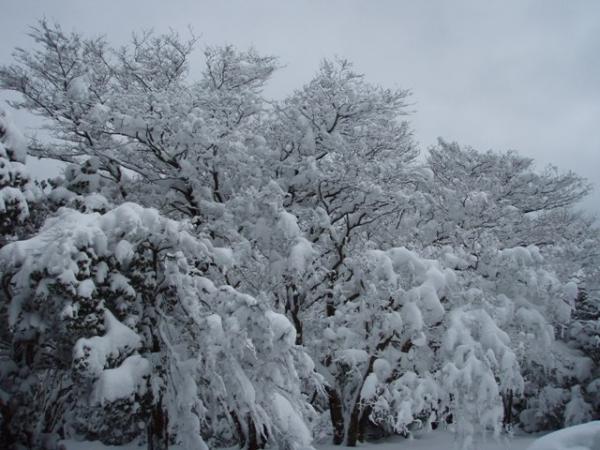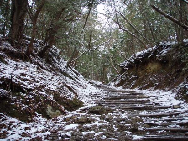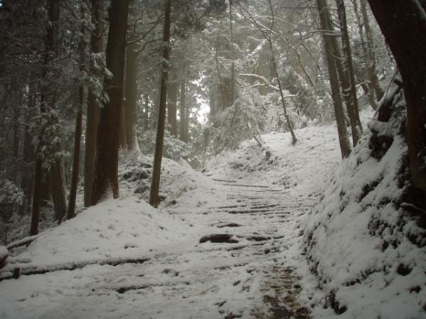 出発から約1時間で五合目休憩所に到着。気温0度。踏み跡に出来た水溜りが凍ってました。隣の高瀬山や京都市内を一望できる所を過ぎた辺りから、登山道にも積雪が2cmぐらい有り。「水尾分かれ」から先は凍った階段の上に雪が積もっており、ツルツル滑って登りにくい所がありました。この辺りから針葉樹林の樹氷が愛宕神社まで続きます。
