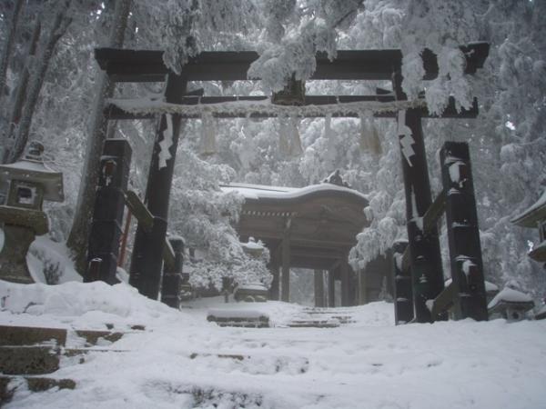 山門を過ぎしばらく進んだ所にある石灯篭も、すっかり雪帽子を被っていました。黒門から本殿までの階段は毎年凍結する難所ですが、幅50cmほどが除雪されていたので、結局アイゼンを使わずに山頂の愛宕神社に到着。三角点なし、展望なし。積雪10cmぐらい。気温-4度でとても寒い。