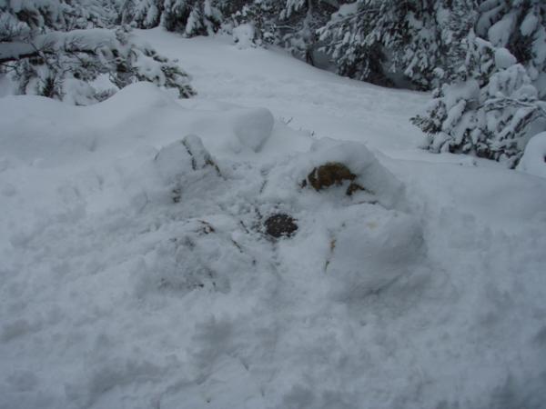 先に進むにつれて雪の積もった低木が重みで登山道に倒れ掛かっており、高さの低いトンネル状態に…。無理して進むと頭上に雪がドサーッと落ちてくるので、屈み込んだ姿勢でしか通過できず、足腰への負担が激しい道程でした。反射板周辺は展望が良く、隣の竜ヶ岳が望めます。三角点から約45分で地蔵山の山頂に到着。三角点あり、展望なし。気温3度、積雪30cmぐらい。日当たり良好。