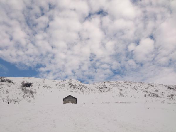 四合目前の分岐を右に入り、滑走ルートを確認、五合目小屋の裏を通過し