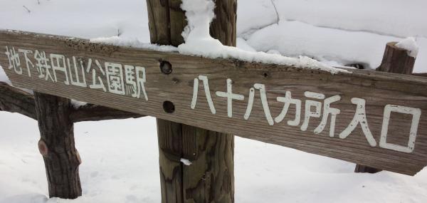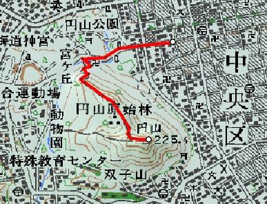 - 地下鉄円山公園駅→(10分)→標識→(5分)→円山登山口→(30分)→分岐→(5分)→山の神・円山山頂→(20分)→円山登山口