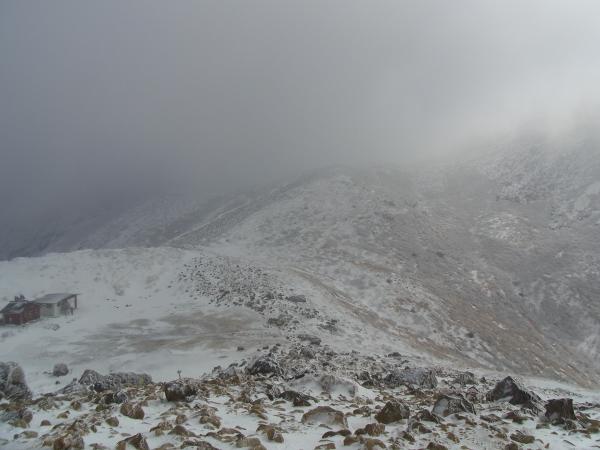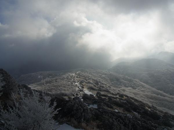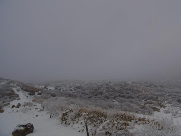 くじゅう山避難小屋あたりから、強風。防寒対策をしっかりと。