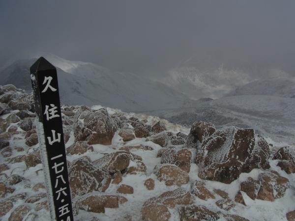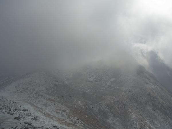 山頂も風が強い!しかもガスで真っ白!!しょうがなく岩陰で風を避けながら小休止。