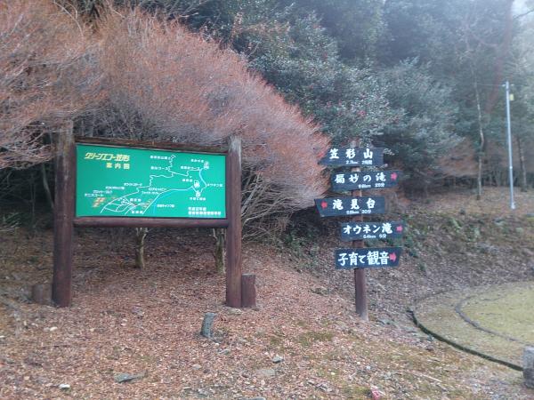 - グリーンエコー笠形(15分)扁妙の滝分岐(7分)オウネン滝(10分)扁妙の滝(5分)滝見台(30分)水辺広場(70分)山頂(100分)三合目下分岐(20分)グリーンエコー笠形