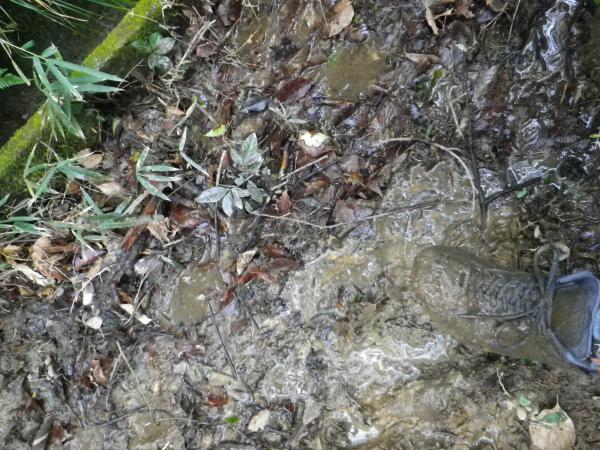 池の手前の道からアプローチするとドロドロの道を歩かないといけなくなります。