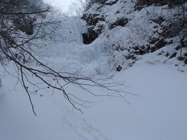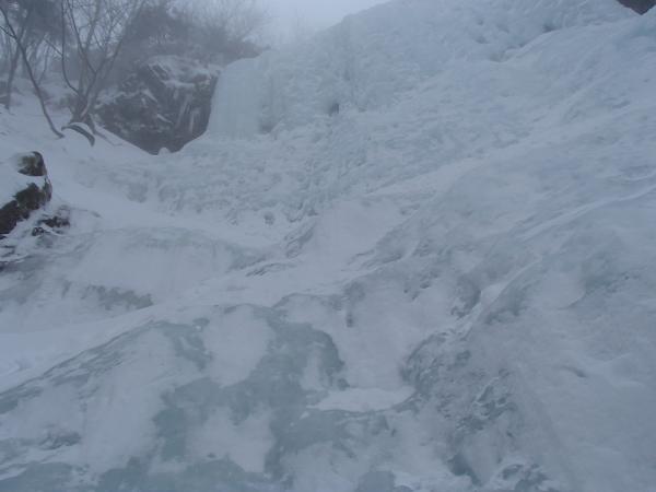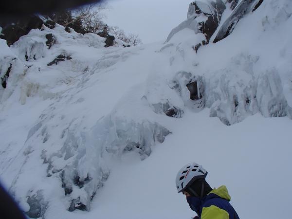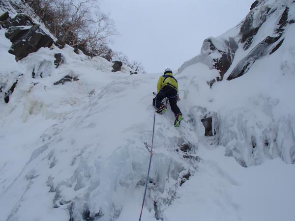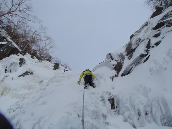 天気予報では2日とも雪でどうなるか心配でしたが、とりあえず、赤岳鉱泉へ行ってみて考えることにしました。赤岳鉱泉に着いてみると雪も止んでいたので、予定通りジョウゴ沢へ行くことにしました。今回は出発時間が遅くなってしまい、F2までしか登れませんでしたが、F1F2とも雪が積もっていて、雪を落としながらのクライミングになりました。