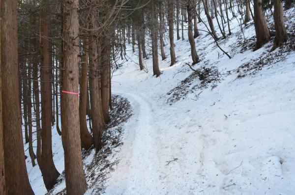 2015年1月24日時点では標高900m付近から凍結と数cmの積雪がありますので、軽アイゼンを着用するとより安全です。