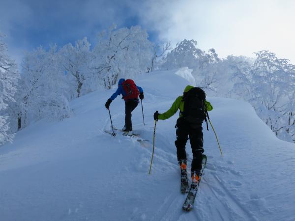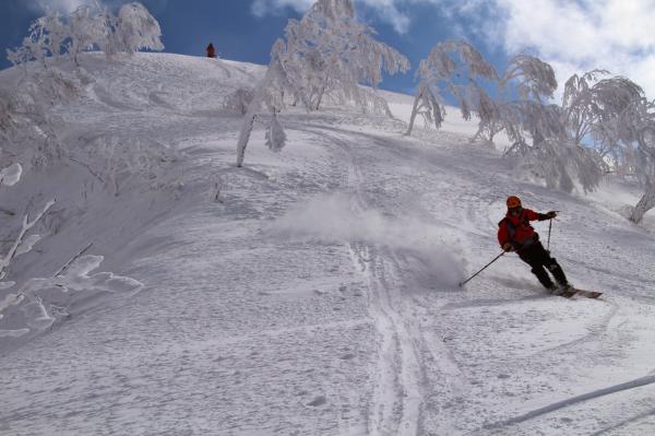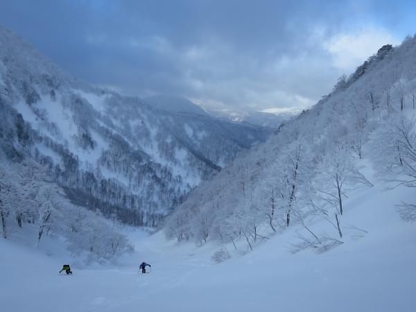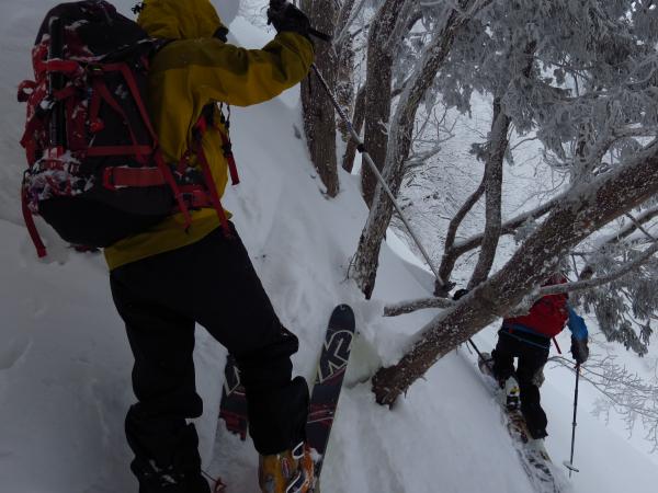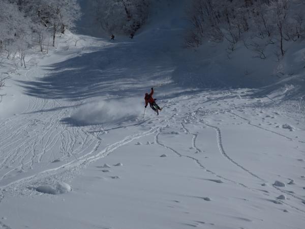 お楽しみの滑降は細尾根を途中まで滑り、そこから急峻な谷へ。