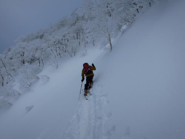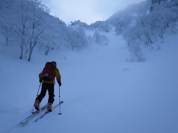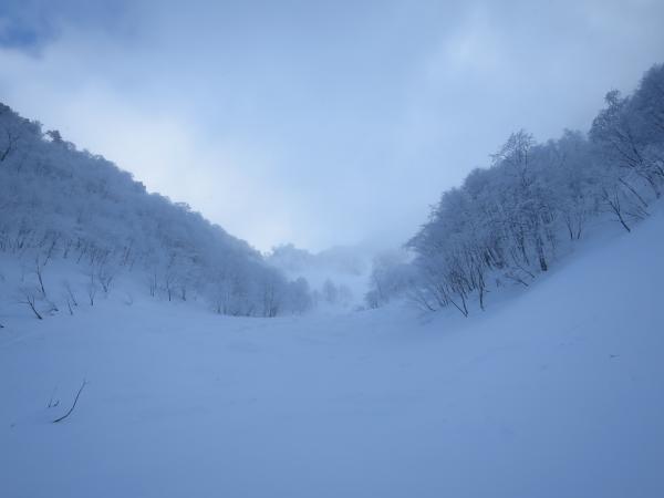 沢は最初は細く割れていたが、中盤以降はとても広くて雄大(即ち雪崩の巣?)
