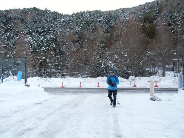 下りは、店長が冬靴のテレマーク滑降で、ぐいぐい曳いてくれたので早めに渋の湯駐車場に下山。