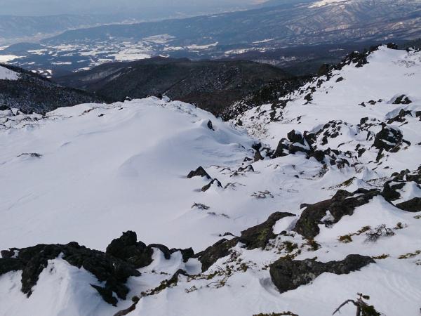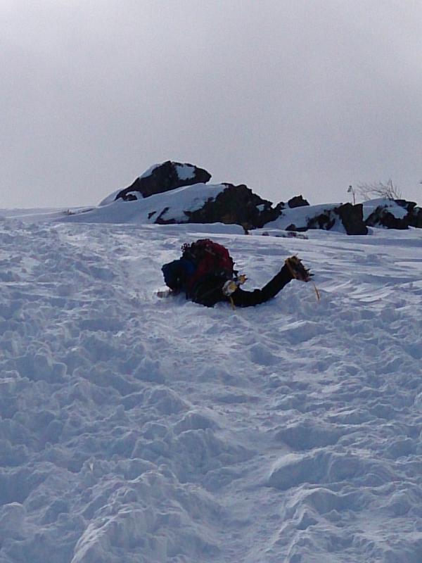 慣れないアイゼン歩行とピッケルの使用によろよろしながらも、天狗に向かって登る。