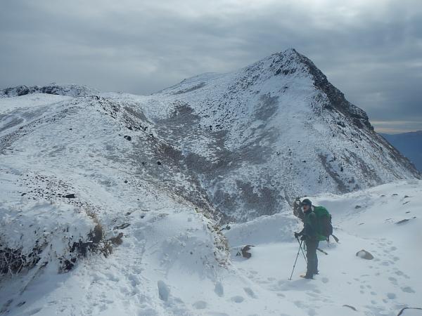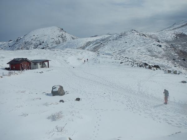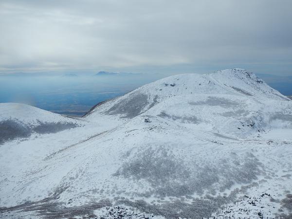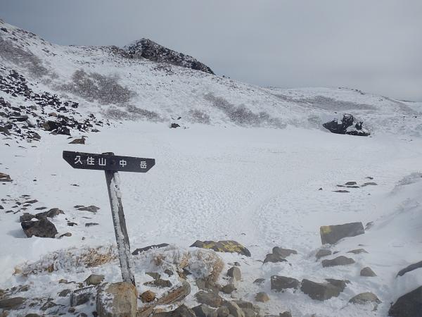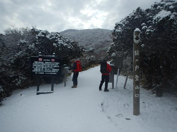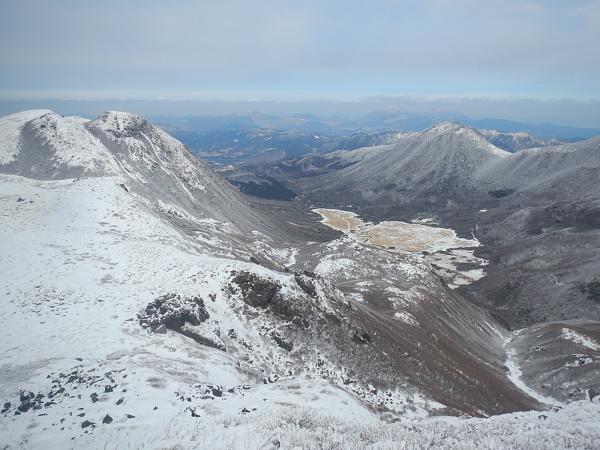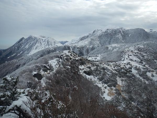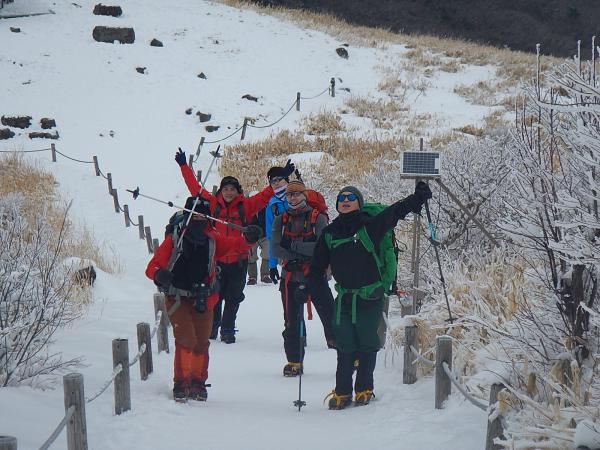 九重の山々は雪をかぶって真っ白に輝いています。沓掛山まで上がると阿蘇の山々と三股山、久住分かれを過ぎると由布岳もキレイに見え、最高の展望!!この頃から雲が出始め快晴とまではいきませんでしたが、それでも見晴らしは良く中岳目指して意気揚々と歩き御池に到着。池は完全に凍っておりその上に10cmほどの雪がかぶっていました。