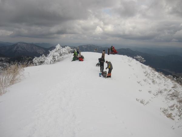 雌滝・雄滝から上は軽アイゼンが必要です。山頂に着くと、平日ですがわりと賑わっていました。