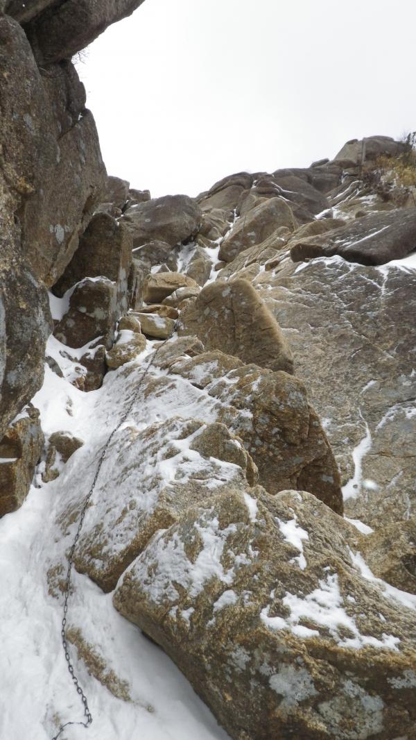 アイゼンを装着すると足元の滑りが無くなり力のロスが減り順調に登ることが出来ました。冬場の登りのポイントはキレットの鎖場よりも、八合目の岩場とその先の最後の登りです。ここだけの為にアイゼンが必要と言ってもいいと思います。(登りに関してですが)