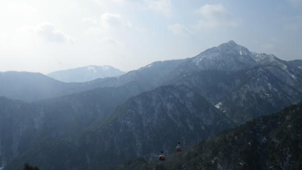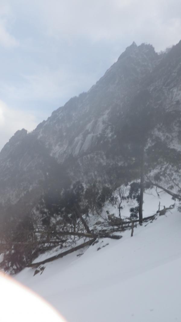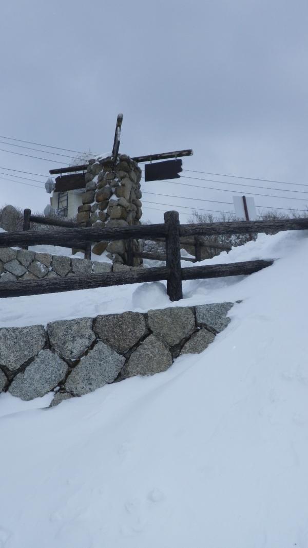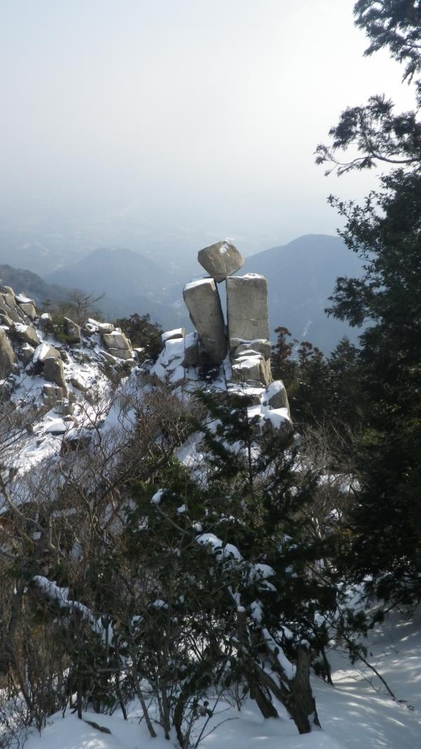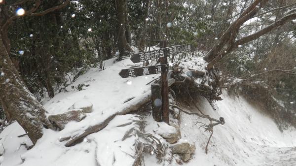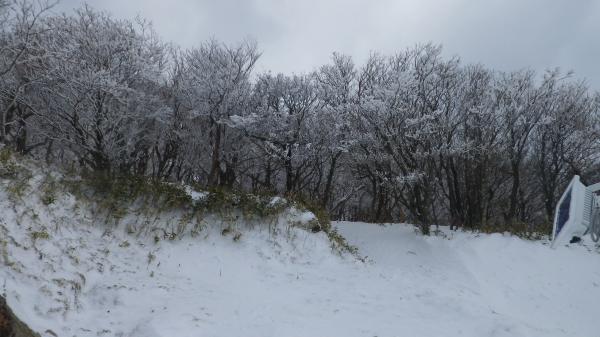最後の登りは10分ほどで朝陽台の出て終了です。山頂に向かう遊歩道は積雪でシロヤシオ等の木が顔の高さになっていて歩きにくいです。