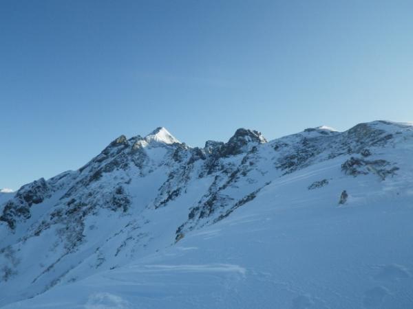 行者小屋からジャンクションピークに繋がる尾根に経験者もっさんの案内で取り付き登るのだがトレースは雪で埋もれて膝くらいの深さをモフモフしながら登ることに。1時間半くらいかけて 太陽の温もりを感じながら草つきの急登に到着。傾斜はそこそこあり所々固い場所もあったりしますが手足の置き場は豊富でした。が足を滑らすともちろん滑落。気は抜けません!