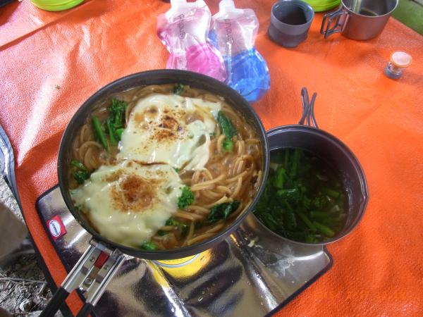 天気がどんより嫌な感じになり少し急ぎ足で向かいキャンプ場近くにある施設看板に屋根がある所(近くにWCあり)で待ちに待ったお昼ご飯作りを開始し楽しい時間を過ごしたら後は下って行くだけ!