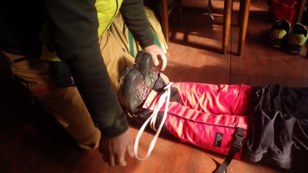 今回の1日目はビーコン探索はせず、ビーコン探索で掘り出した要救(ここでは雪崩に巻き込まれた方のこと)を、搬出する方法を学びました。