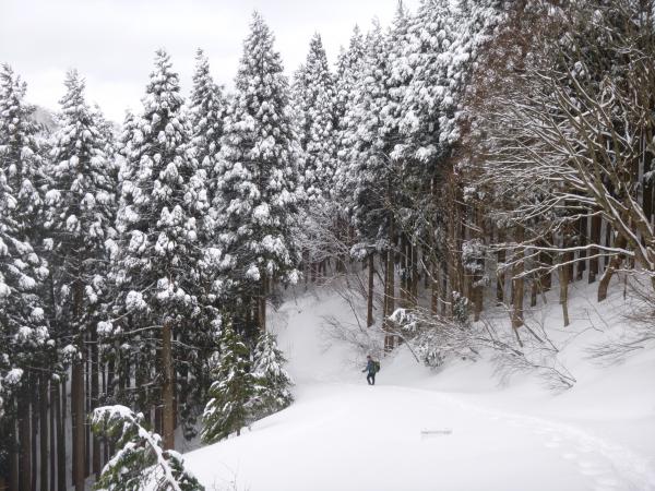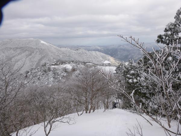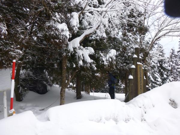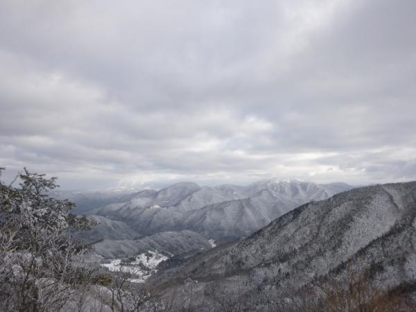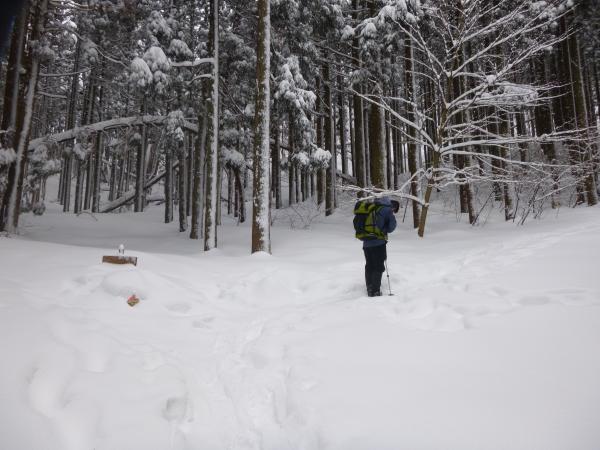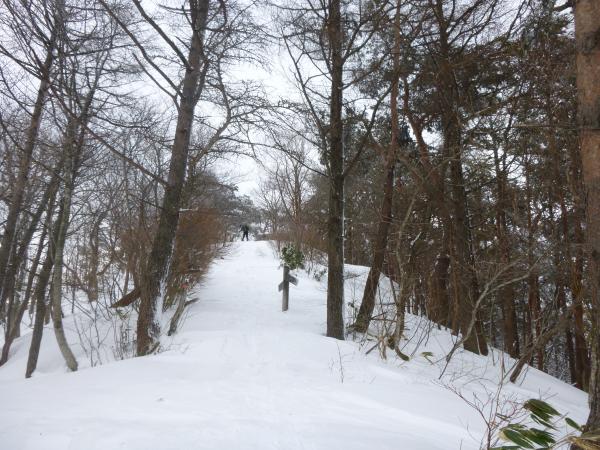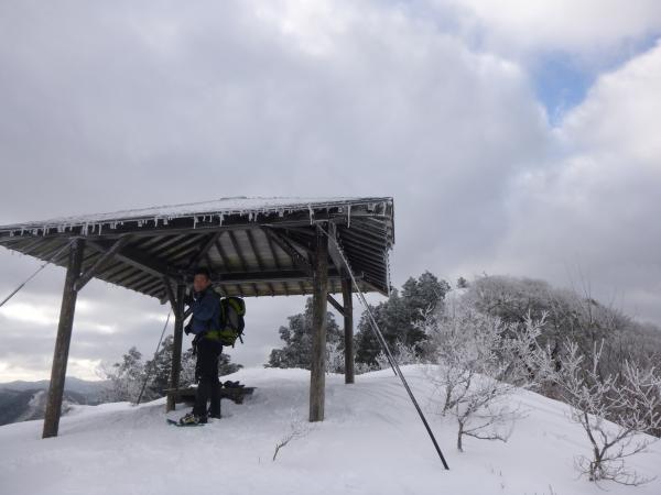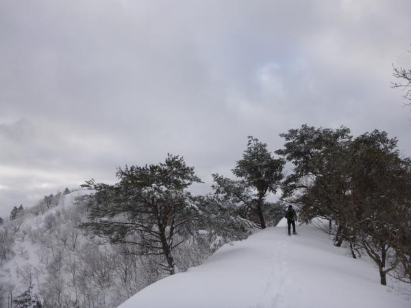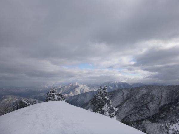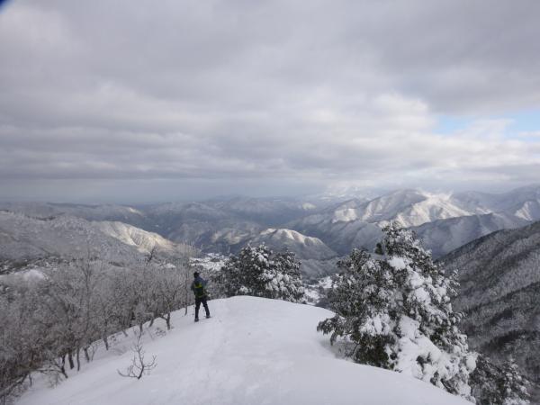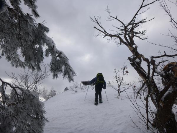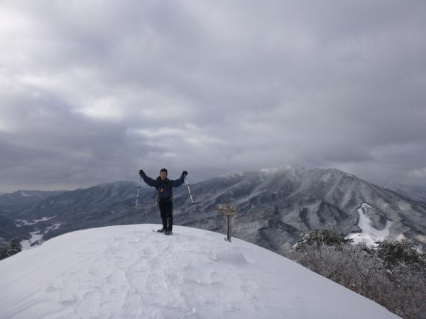 明智トンネルの南口に車を置きました。人工林、天然林の中を登っていきます。稜線に出ると一気に視界が広がります。山頂は360度の展望です。残念ながら大山は雲の中でした。稜線は県境で吹きさらしなので寒さに注意しましょう。また稜線の両側は急なので寄りすぎて落ちないようにしましょう。スノーシューに向いた山です。