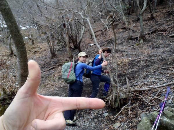 看板「5」を過ぎたら注意深く右側を意識して、たくさんの踏み跡があったらそこを登ると福寿草の群生があります!
