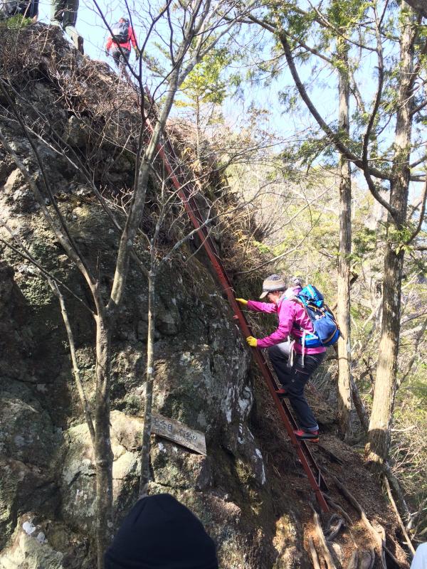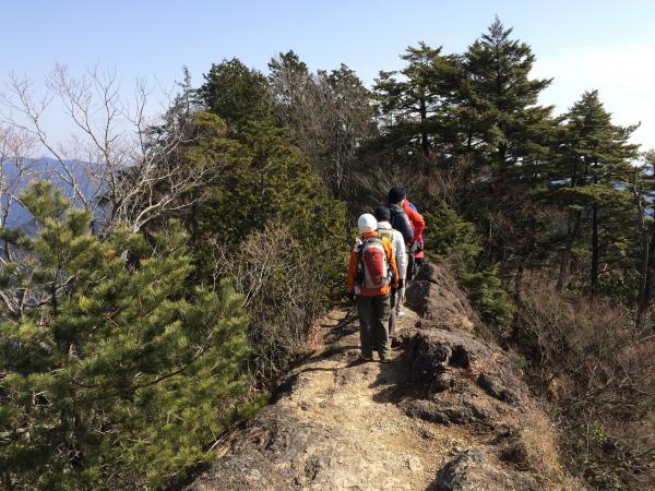 山頂付近には鎖場、ハシゴ、やせ尾根、など低山ながらも