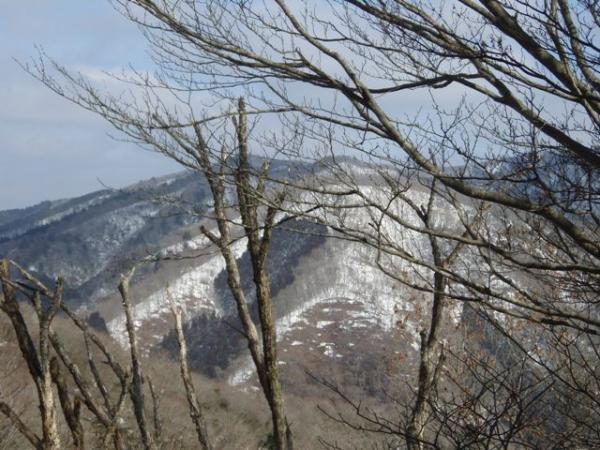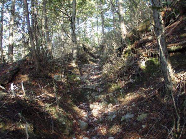バス停・小出石を出発して国道477号線を北西に進んだ所にある登山口から入山。薄暗い植林地を抜け沢沿いの道を登り、木橋を渡ってロープの張られた急坂を越すと、V字型に削られた登山道に出る。結構急勾配の道でしたが、しばらく進むと周囲が明るくなり、樹間から水井山や横高山方面が望めます。
