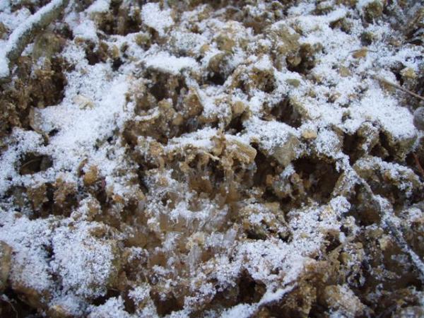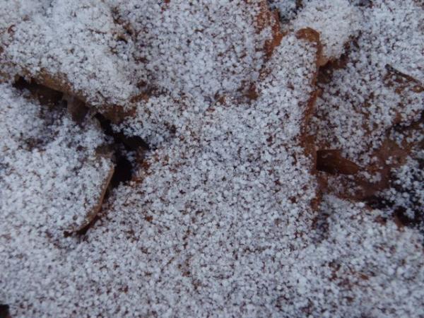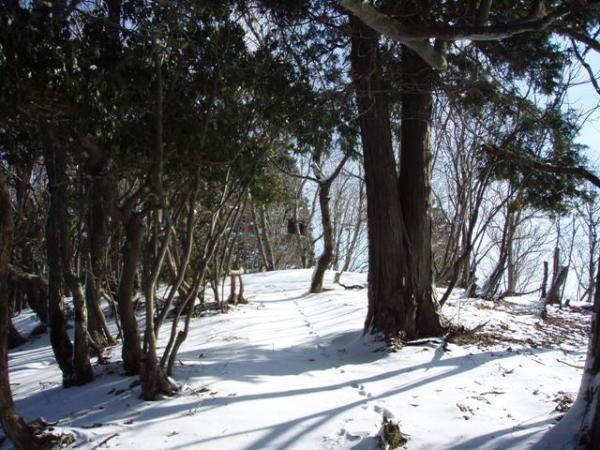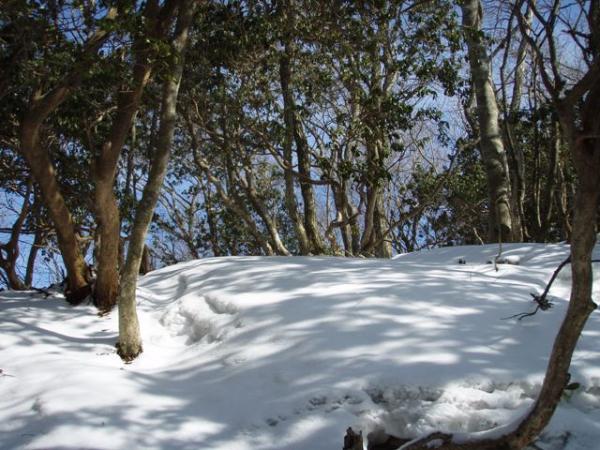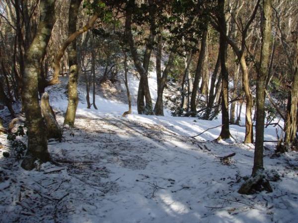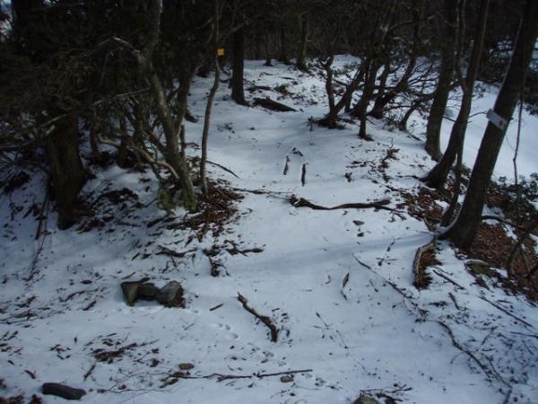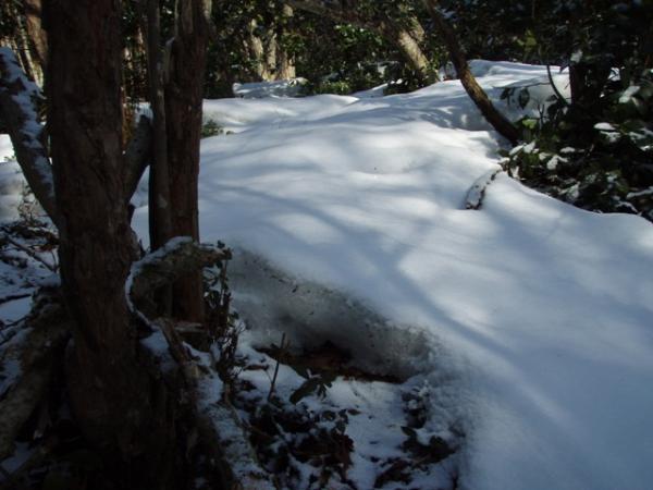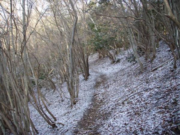 勾配がゆるやかになってきた辺りから、うっすらと積雪有り。踏み跡が無い所を見ると、最近降った雪らしい。粒の大きさは結構大きく、一部の登山道は地面が凍っていました。