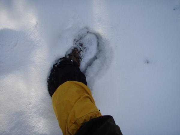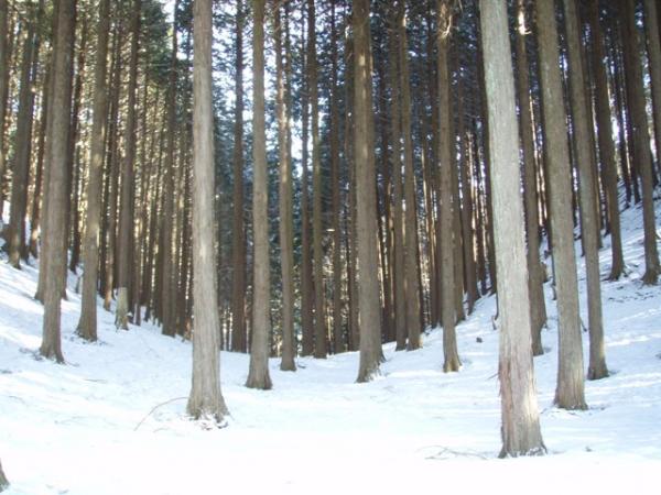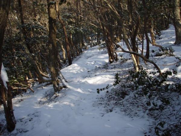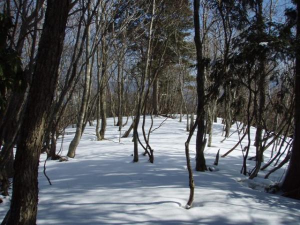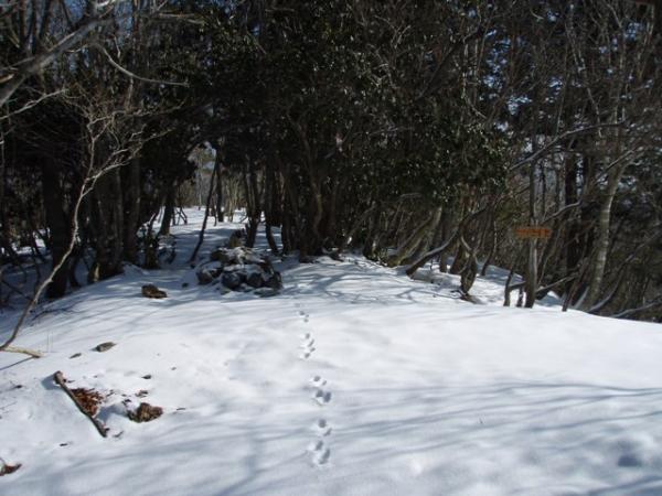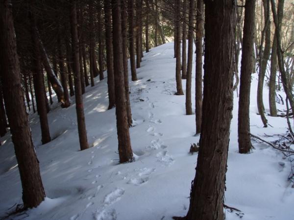 陽当りの良い所は地面が見えているものの、深い所では15cmぐらい登山靴が雪に埋もれるので、なるべく鹿の足跡を追うようにして歩く事にする。