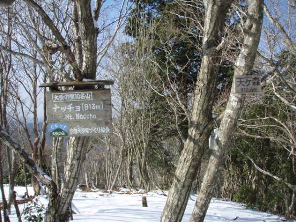 ナッチョ谷との合流地点から先はびっしり雪が付いていましたが、しっかりと締まった雪のおかげで快適に進めました。出発から約80分でナッチョ(天ヶ森)の山頂に到着。三角点あり、展望あり。気温3度。積雪15cmぐらいですが、ほとんど沈まないです。