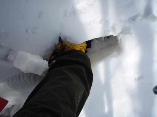 最初はテープの目印に従って進みましたが、途中で近道する為に急斜面を下って行くと40~50cmぐらい雪に埋もれて結構苦戦しました…。ここから沢までの間は登りの際には迷い易そうな感じでした。
