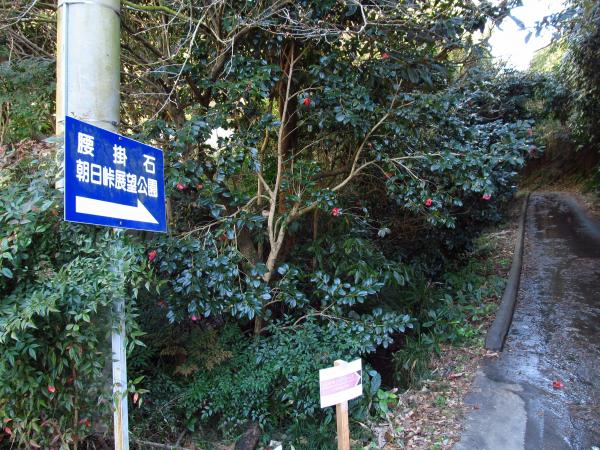 「小町の館」敷地内の案内板に従って舗装道路を少し歩いていきます、細い道に入り、一般の家庭のお庭に小町が座ったといういわれの腰掛石があります。さらにのどかな田園の横を通って山道に入ります。