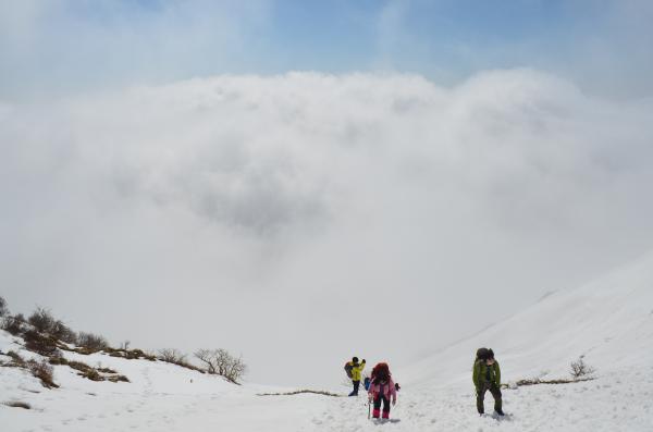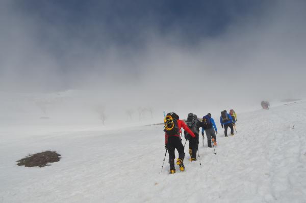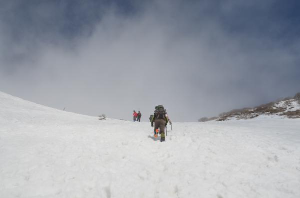 3合目からはやっと雪を踏んで歩けますが、ところどころ途切れていて、まさに「残雪」という感じです。