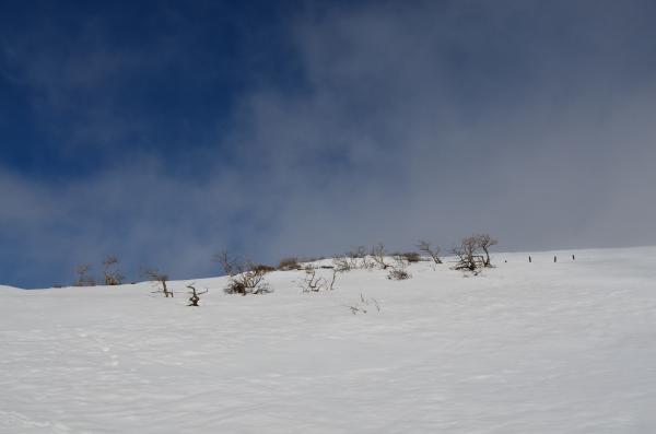 3合目から6合目までは積雪していますが、ところどころ途切れています。
