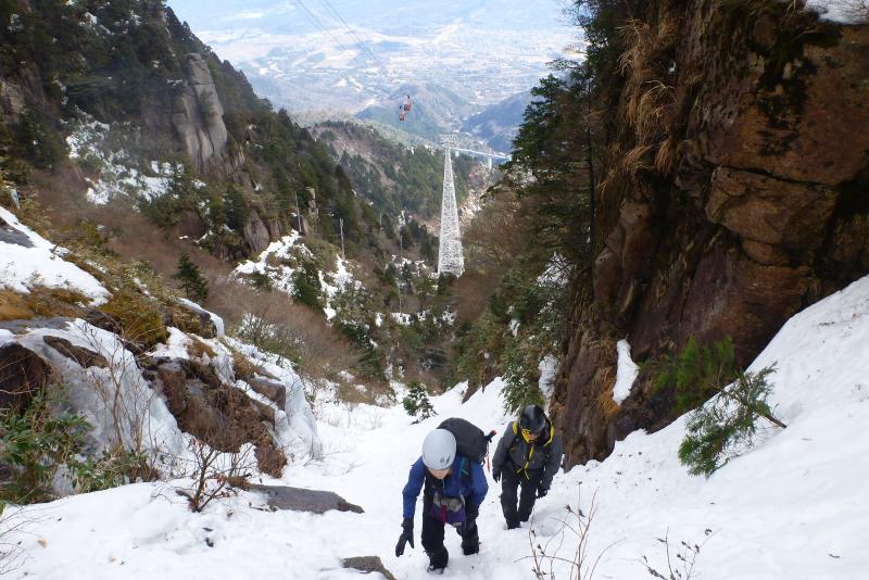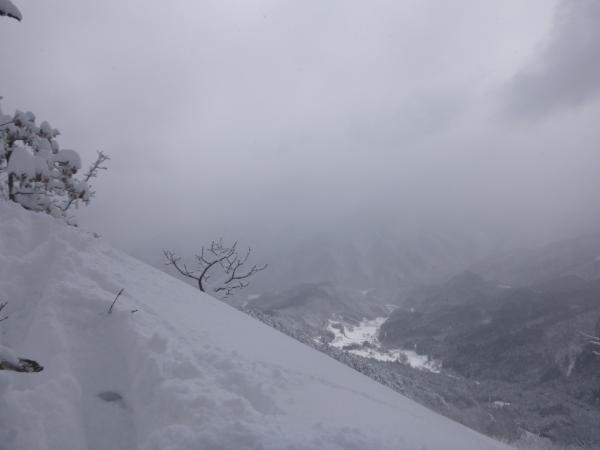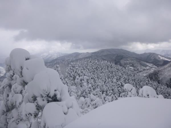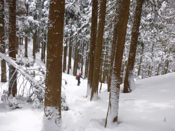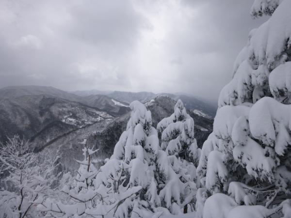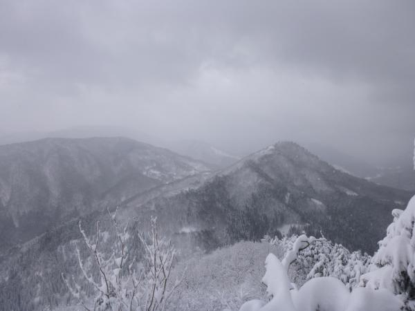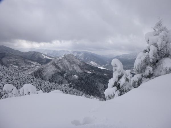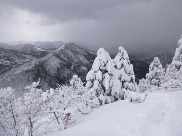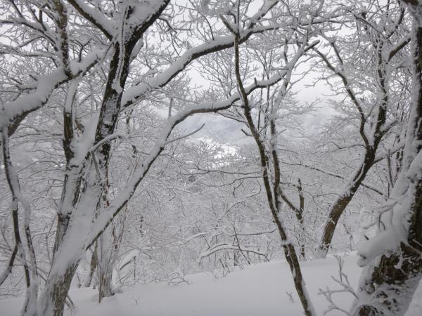 分岐点を右に行くと剣山ですが 今回は左へ行き三日月山を目指します。踏み跡は無いので判断しながら登ります。危険なところはないのですが 山頂付近で開けたところが(滑り落ちるかも)唯一の難所です。全体的に急な登りで 体力的にきつかったです。樹林の中がほとんどですが 時々展望が開けます。