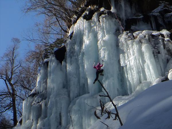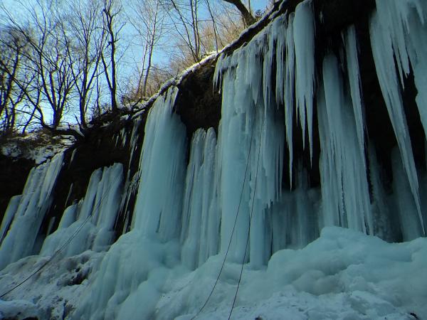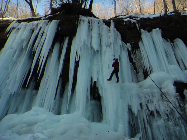 - 氷は完全に氷結しており、奥の氷柱も登れるほどになっていました。2月にもなればしっかり楽しめるエリアになっているようです。固く凍っているので、割れて顔が傷付いてしまわないよう注意が必要です。