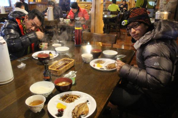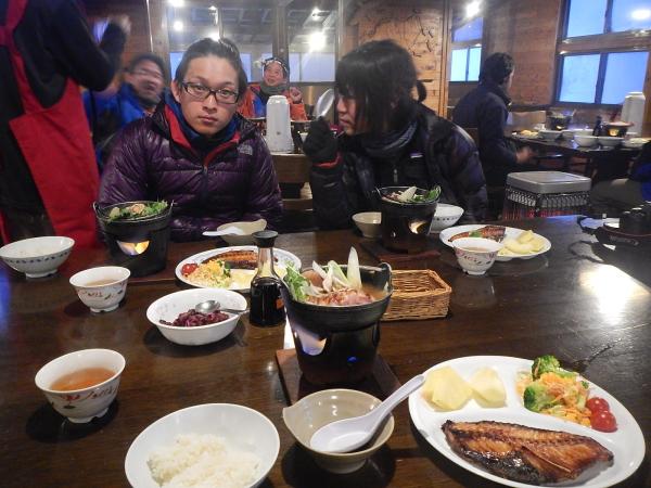 赤岳鉱泉の夕食は前日とはまた別のメニュー、お腹いっぱいで宿のお客様と地元大雪渓で盛り上がりました。