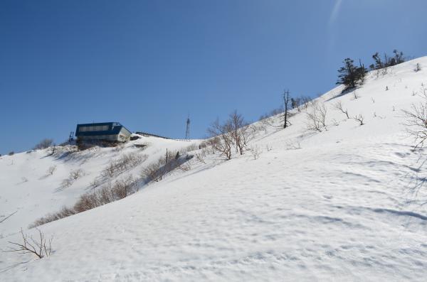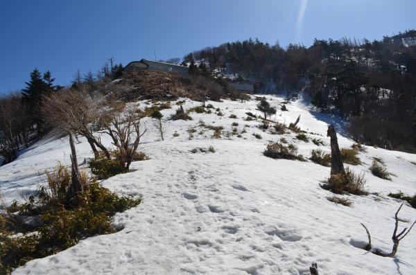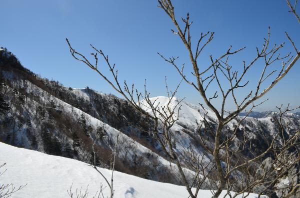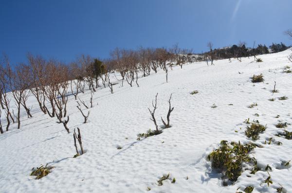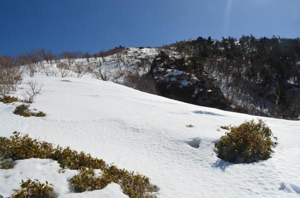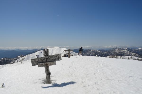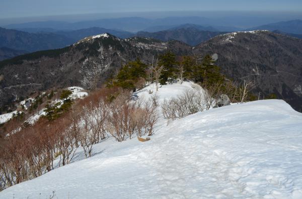 登る前は次郎笈まで行こうと思っていましたが、この日は気温が高く、雪の状態が悪くかなり難儀しそうなので、やめました。