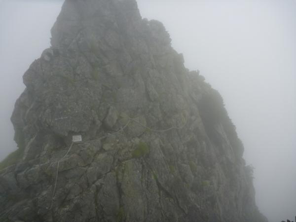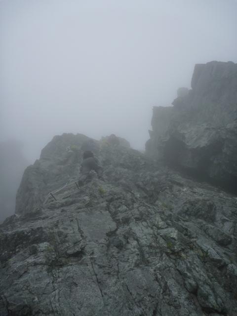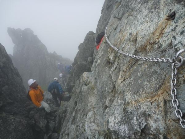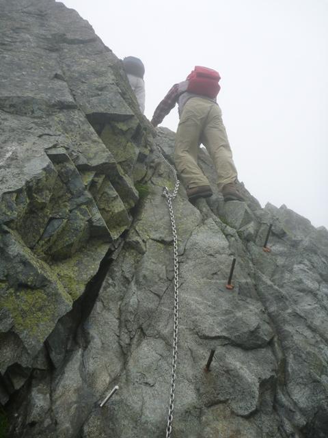 要所要所にはしっかりとした鎖が取り付けられており、足場を確認しながら歩けば問題ないですが、一歩間違うと大きな事故につながる箇所の連続です。この日は朝のうちに降った雨で岩が濡れており、ちょっと緊張しました。この日も午後からは雨。雷も鳴っていました。寒気が入り込むと午後からは雨になるようです。