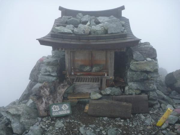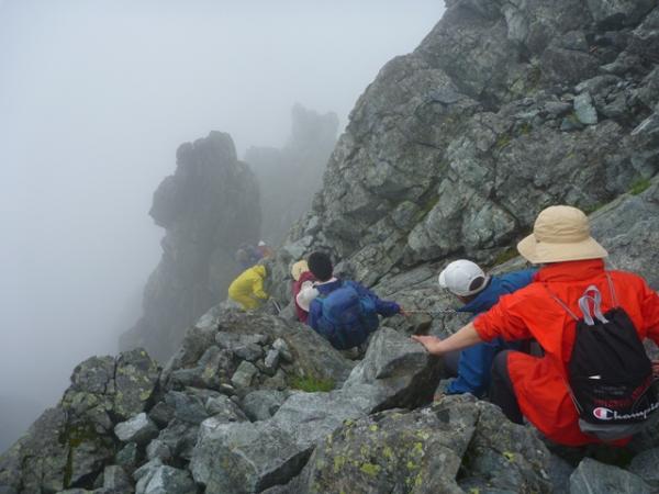 稜線に上がると、室堂側から吹き上げてくる風とガスでかなり気温が下がっていました。レインウェアを着て歩いても寒いくらいです。真夏とはいえ侮れません。