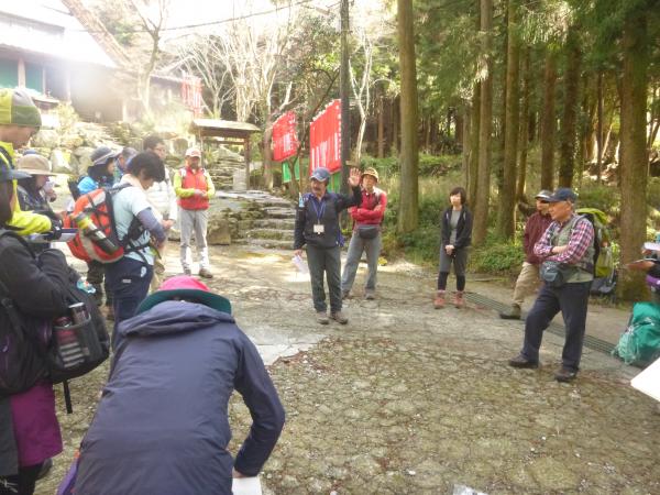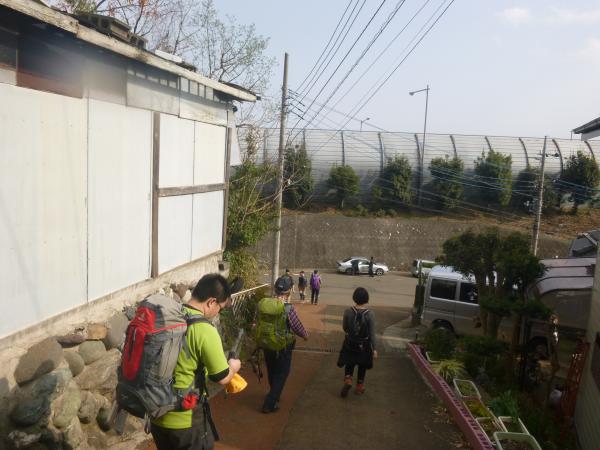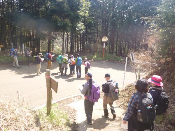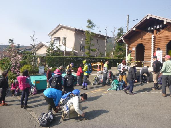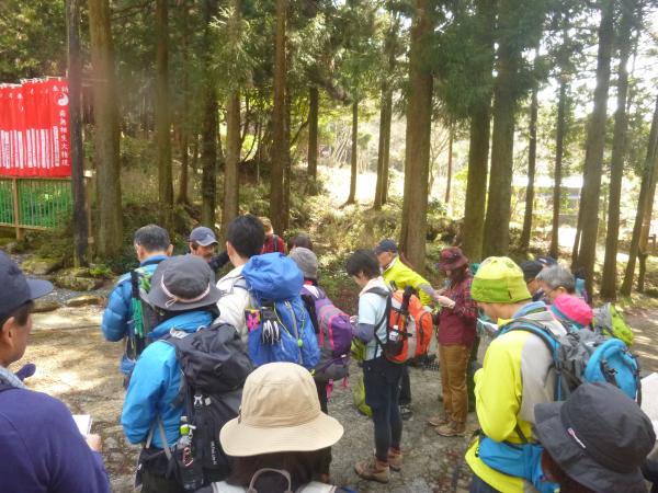 蓑毛バス停に到着して、準備を済まして出発。すぐ先にある神社前の広場にて