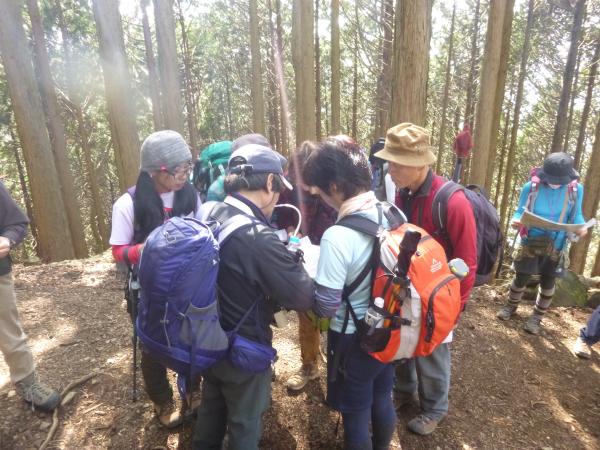 途中の林道にでる場所や尾根に出る前の分岐で地図とコンパスを出して