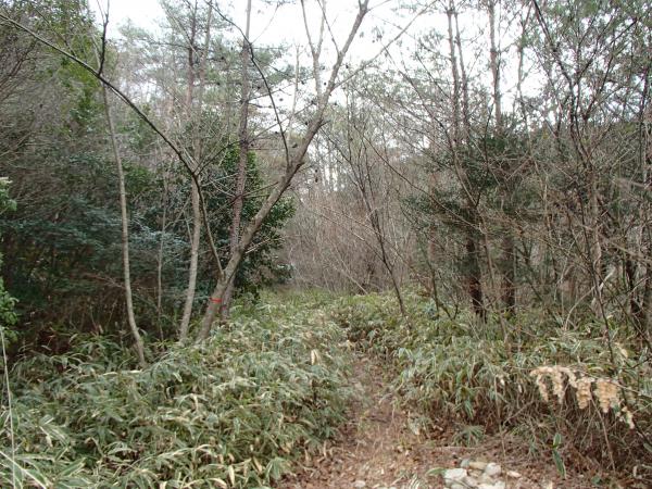 踏み跡と行く先、赤いテープを見逃さないように歩きましょう。