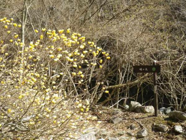 透き通った沢の音、明るい木漏れ日。登山道付近では黄色い万作の木が丁度満開でした。