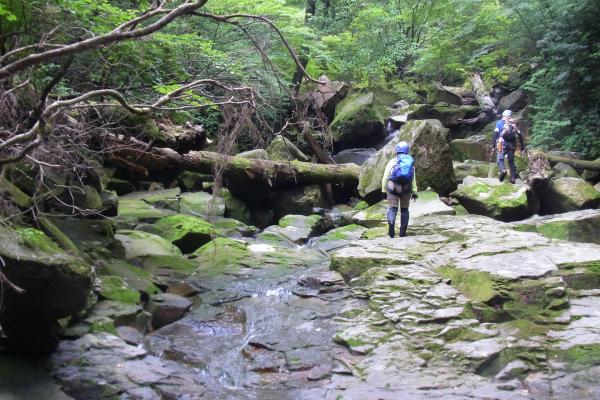 後半は、苔むした森、岩場、登山道とすべてを楽しめる沢です。