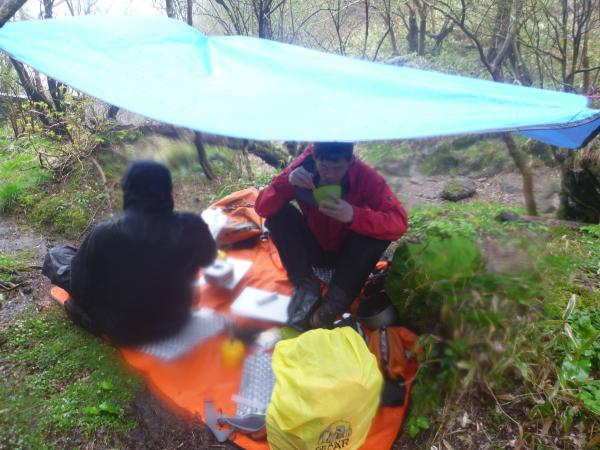 そして、なぜか、こんな天気が悪いのに、、、意地になって(?)ランチタイム。紅葉茶屋の分岐でエマージェンシーシートで屋根を作りご飯。いや、これも経験、経験。