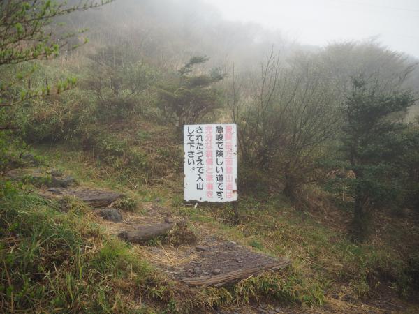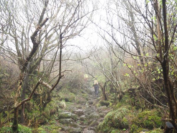 登山口の仁多峠へあがる道路がなんと濃霧のため通行止。池ノ原園地駐車場からスタート。こから仁多峠へはひたすら整備された階段をてくてく。ひたすら階段をてくてく、、、30分。仁多峠に到着。今日はキリのため周りの様子がさっぱり見えず。。。どこから入っていくんだ?!